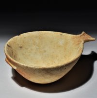 Tiefe, dünnwandige, sehr gleichmäßig gearbeitete Schale mit konkav geschwungenem Becken von sehr eleganter Form mit Griffansatz und harmonisch in das Rund der Wandung übergehendem, sich erweiternden Ausguss. Einmal gebrochen, ein Teil des Randes ergänzt.